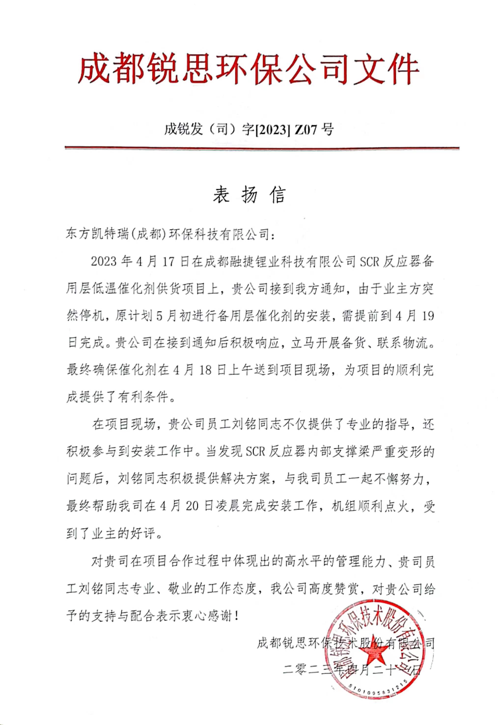4月17日,接到項目合作方成都銳思環(huán)保技術股份有限公司的通知,由我公司5月上旬供貨的成都融捷鋰業(yè)科技有限公司SCR低溫脫硝催化劑項目,因業(yè)主方設備提前停機需4月19日安裝的要求。 用戶的需求就是命令,接到業(yè)主提前交貨安裝的通知后,急用戶之所急,市場項目部立即行動,項目負責人以最快的速度組織備貨,聯(lián)系物流,18日將該項目產品發(fā)運至項目現場。 為了保證工期,做好現場服務,市場項目部安排業(yè)務過硬、責任心強的劉銘同志第一時間趕到現場協(xié)助業(yè)主收貨、驗貨,盡職盡責指導催化劑模塊安裝工作,全程進行技術指導與交底,在過程中發(fā)現并解決了反應器內催化劑支撐梁嚴重變形的技術問題,經過徹夜奮戰(zhàn),于次日上午順利完成安裝任務,最終確保催化劑安裝如期完成,機組順利點火。 本次任務的圓滿完成,充分體現了我公司一切急用戶急,全力為用戶排憂解難的24小時服務精神。項目合作方和業(yè)主對東方凱特瑞在項目合作中展現的高水平管理能力和項目團隊專業(yè)、敬業(yè)且負責的工作態(tài)度給予了高度贊揚,并發(fā)來表揚信表示感謝。